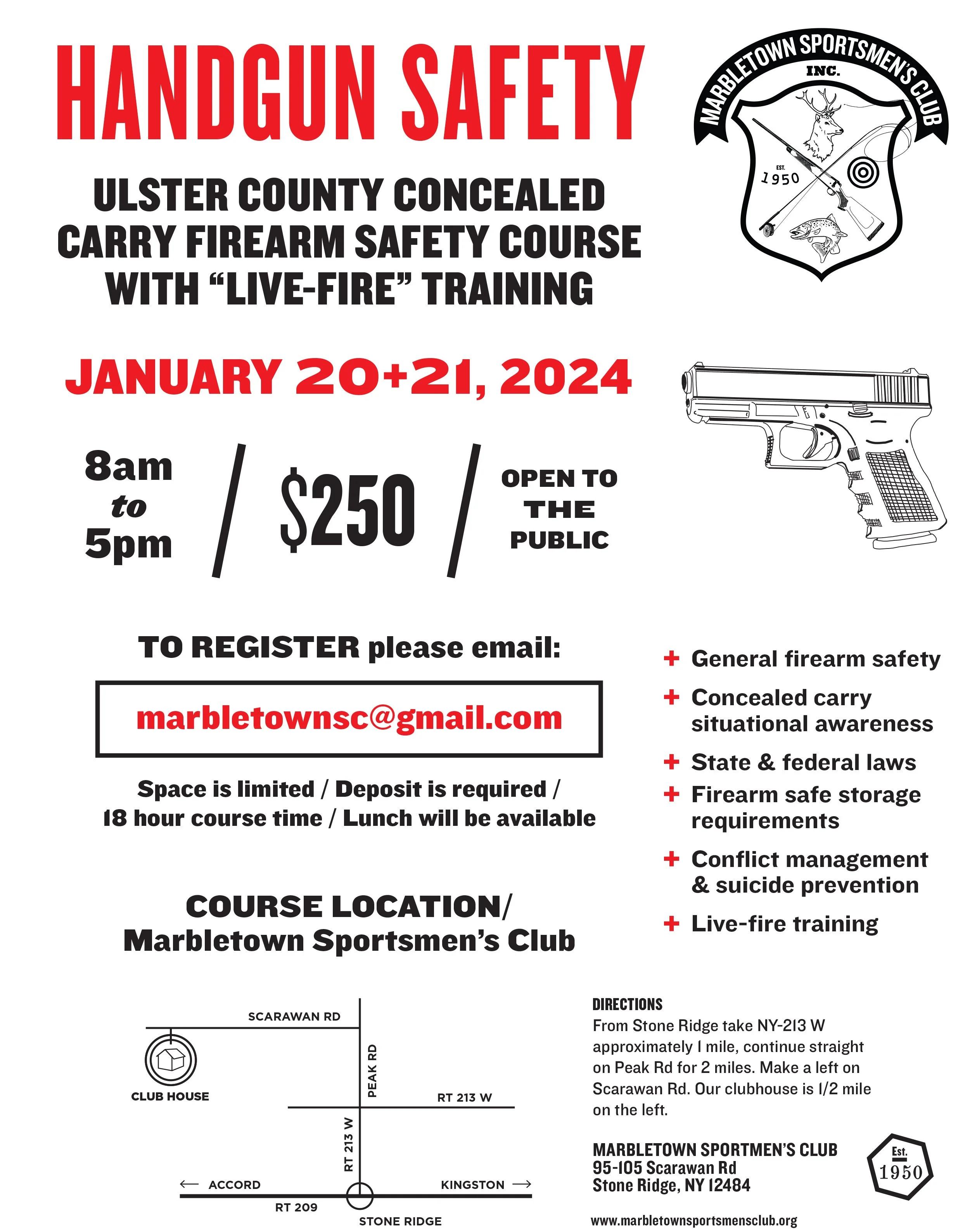 Handgun Safety Course Saturday, January 20, 2024 8:00 AM Sunday, January 21, 2024 5:30 PM Marbletown Sportsmen's Club, Inc. 105 Scarawan Road Stone Ridge, NY, 12484 United States (map) Google Calendar ICS
